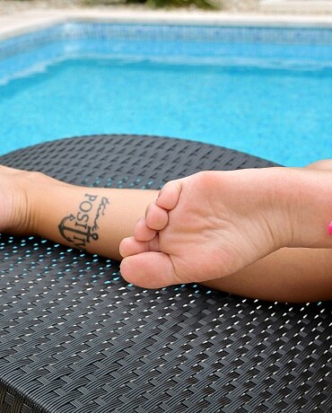 This web site contains sexually explicit material:Czech stunner Jenifer Jane is soaking up the summer sun by the pool, barefoot and glistening in oil as she rubs down her tight bikini-clad body. The heat isn’t just from the weather — this horny brunette is ready for action. So when insurance agent Raul Costa stops by, she seizes the moment to give him a poolside footjob he’ll never forget. Inviting him to help oil her smooth, toned legs, Jenifer awakens the leg lover in Raul, who quickly gets hard from the touch. She catches the bulge, flashes a hungry smile, and slides her pretty size 38 feet along his shaft. One thing leads to another, and soon her lips are wrapped around his cock, taking him deep with slow, wet strokes. But this tattooed temptress isn’t done. Stripping down fully, she gets bent over the lounge chair for a deep doggy style session, then mounts him in reverse cowgirl, bouncing until Raul finally explodes all over her beautiful feet. Shot in stunning 4K, this foot fetish scene is pure poolside seduction.