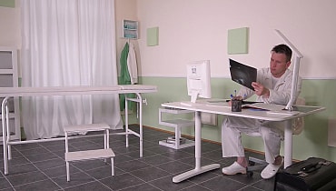 This web site contains sexually explicit material:When Demetris visits Dr. Choky Ice with a sore ankle, the appointment turns into pure foot fetish ecstasy. The Hungarian brunette with green eyes and petite breasts slips off her high heels, revealing flawless soles that instantly capture the horny doctor’s attention. He kisses and sucks her toes while she massages his shaft with her bare feet, her arches gliding over his length. Sliding his fingers into her wet pussy, Choky teases her before she drops to her knees for a deep blowjob, letting him lick her soles as her tongue plays with his tip. Bent over the table, she moans as he fucks her from behind, then climbs on top for a bouncing cowgirl ride. Her tattoo above her clit peeks into view as she grinds on his cock. The scene ends with Demetris stroking him with her feet until he spills a hot load across her toes, leaving them glistening for every foot lover’s fantasy.