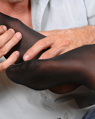 This web site contains sexually explicit material:British Amazon Paige Turnah shows off her flawless legs, red toes, and sheer black thigh highs in a fetish session that proves her spectacular sole skills. Distracted from her laptop by Choky Ice, she lets him sniff her heels and suck her nylon-clad toes before wrapping her size 9 feet around his cock. Paige strokes him with her soles, slides his shaft between her calves, and even sucks her own toes while rubbing his dick. Overhead shots capture her wrinkled arches pumping his shaft until he unloads a huge creamy finish all over her nylons. With shoes slipped back onto her cum-covered feet, Paige returns to her desk in true fetish style.